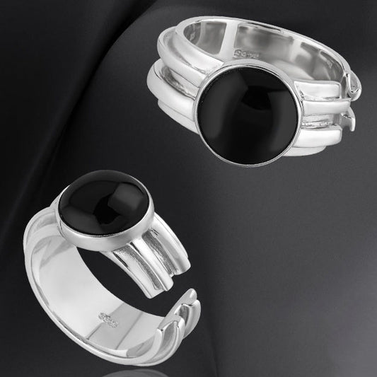 Men Simple Round Black Agate 925 Sterling Silver Adjustable Ring