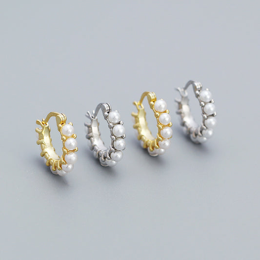 Women Round Mini Shell Pearls 925 Sterling Silver Hoop Earrings